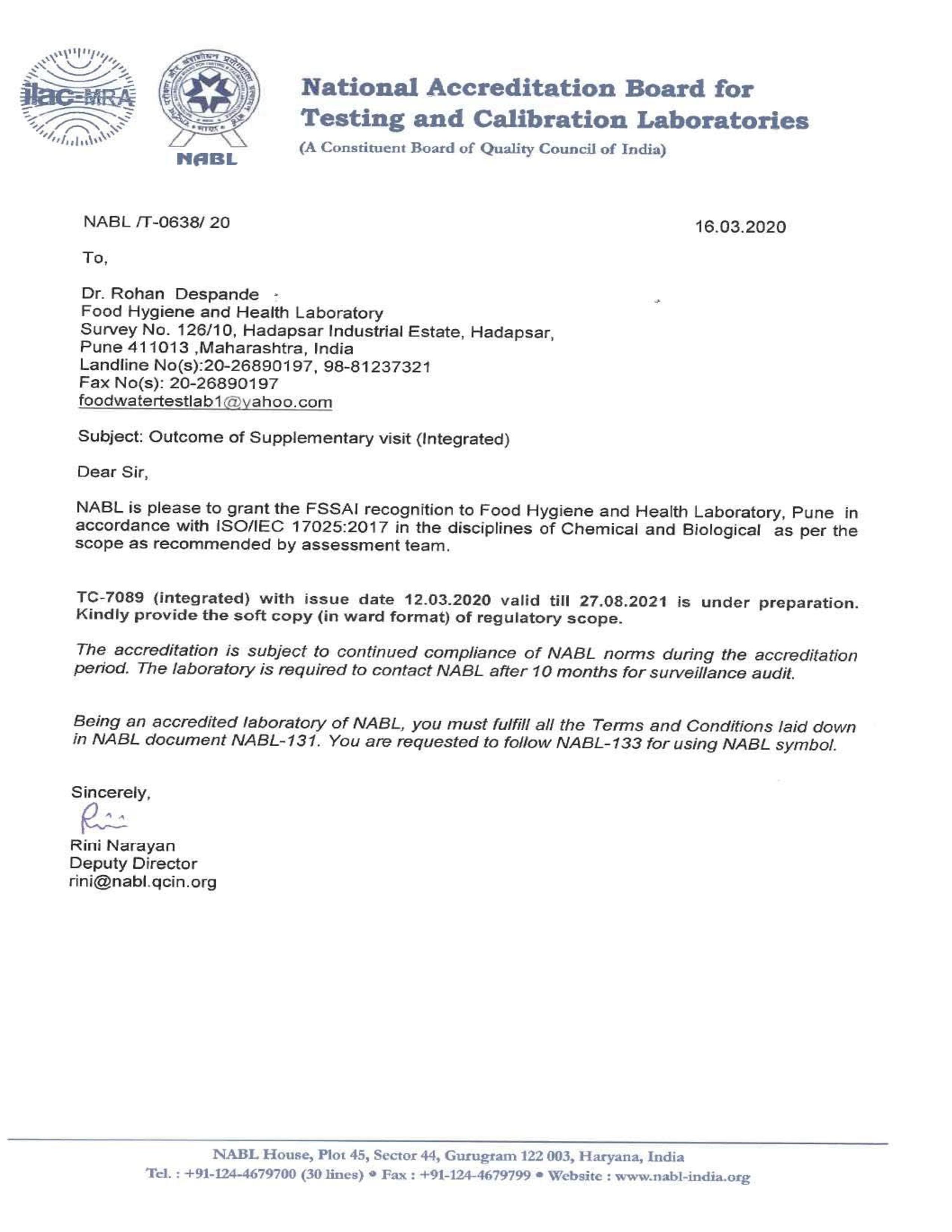 FSSAI - NABL Recognition Letter